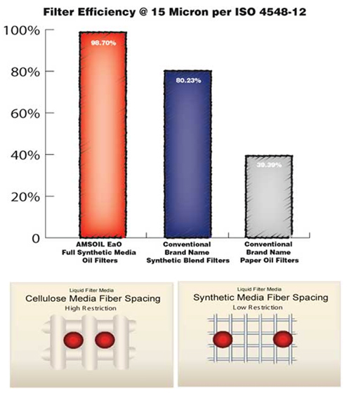AMSOIL Ea Oil Filters (EaO) have the best efficiency rating in the industry. EaO Filters provide a filtering efficiency in accordance with industry standard ISO 4548-12 of 98.7 percent at 15 microns, while competitive filters containing conventional cellulose medias range from 40 to 80 percent efficiency.