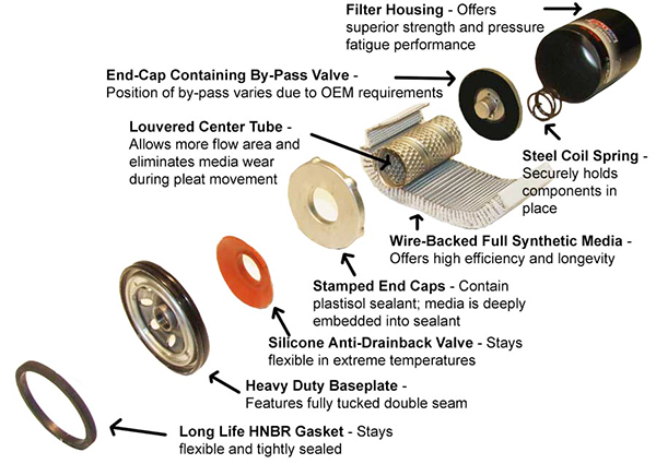 WIX oil filters use an up-front by-pass valve. This design is superior to top-mounted valves because it helps to keep oil from washing past dirty media and entering the engine. The glass-enhanced media in WIX oil filters offers greater efficiency, capturing more 10 to 12 micron sized particles than other cellulose/synthetic blend medias. They also have a coil steel spring to ensure internal filter parts are sealed properly.